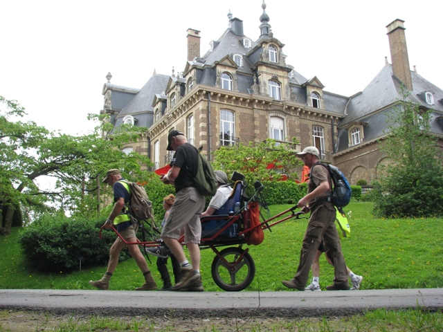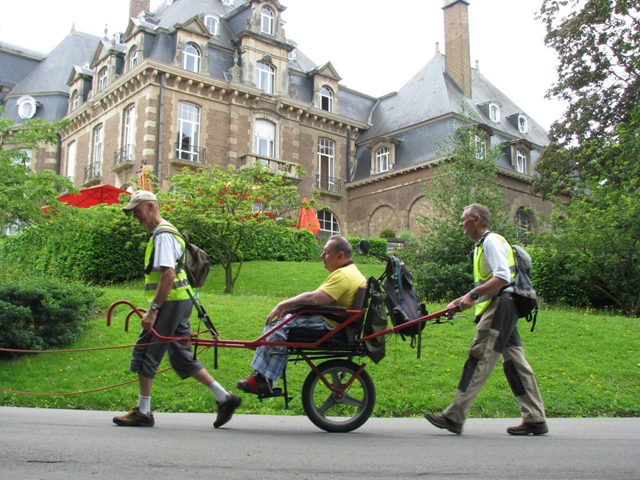Départ et arrivée à l'auberge de jeunesse de La Plante avec 4 joëlettes et 19 accompagnateurs.