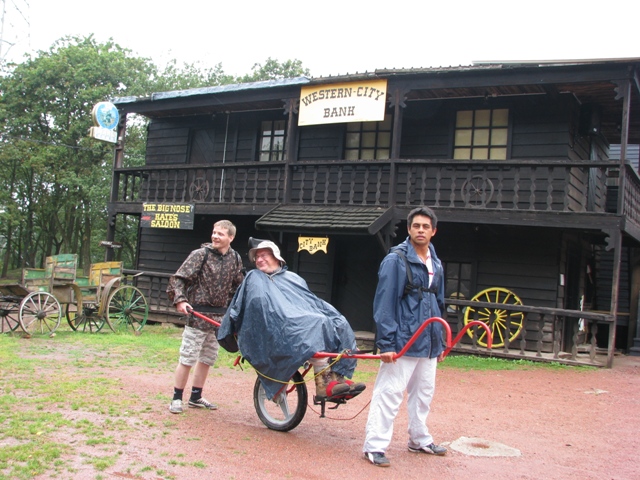 Le casino de Chaudfontaine à l'arrière-plan. Allons-nous y entrer avec les joëlettes ?