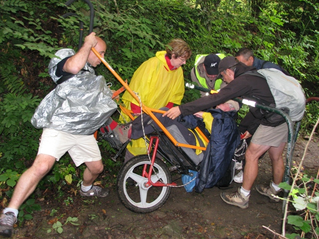 Superbe balade d'une douzaine de km, d'environ 300 m de dénivelé mais avec de fréquentes averses. 7 joëlettes et environ 21 accompagnateurs.