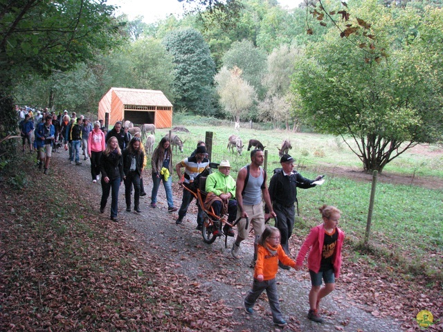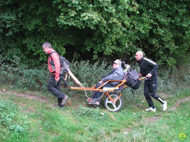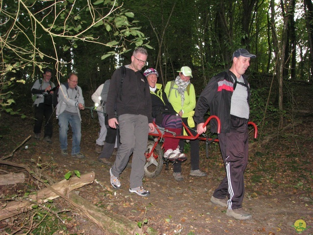 Premier tronçon de Marche-en-Famenne à Hotton, par le GR577, du défi des 100km pour Cap48. Distance de 12km060, dénivelé positif de 160m, 5 joëlettes et 24 accompagnateurs.